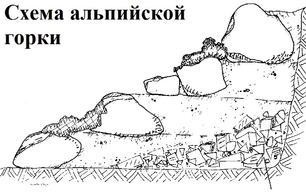 3. Sau khi làm sạch, diện tích của ngọn đồi được phủ sỏi, xỉ và chất thải xây dựng (gạch sứt mẻ, đá granit nghiền nát), độ dày của các lớp này nên khoảng 10 cm. Một "chiếc gối" như vậy sẽ bảo vệ rễ của hoa khỏi độ ẩm quá mức, sẽ không cho phép nước đọng, và sẽ đảm bảo sục khí bình thường. Lớp sỏi bảo vệ này và các vật liệu khác có thể nhìn thấy rõ trên sơ đồ trượt trên núi cao.