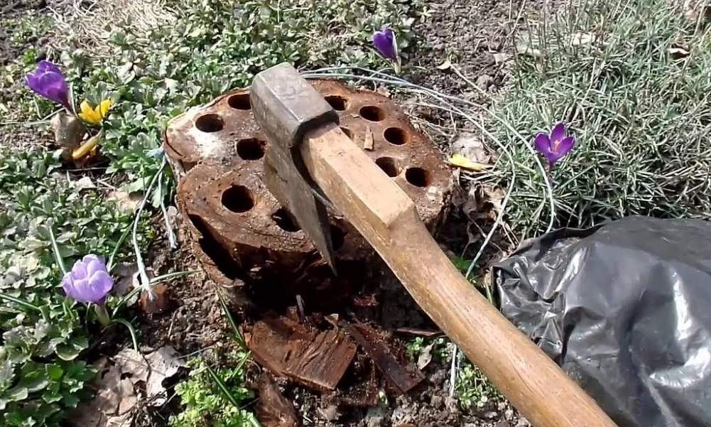 Để loại bỏ phần còn lại của cây, đặc biệt là một cây lớn và khá cũ, cần có sức mạnh thể chất đáng kể. Bạn có thể đơn giản hóa nhiệm vụ bằng cách sử dụng các giải pháp của hóa chất được bán tự do trong các hiệu thuốc và cửa hàng gia dụng. Giống như bất kỳ chất hữu cơ nào, gỗ nhanh chóng bị phân hủy dưới tác động của các chất ăn da. Hiệu quả nhất bao gồm:
