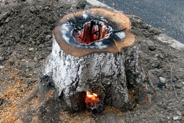 Nếu nước được cung cấp đúng tiến độ và chịu áp lực nhẹ, như trong các công ty làm vườn, tốt hơn là nên nhờ đến sự trợ giúp của lửa. Cũng cần phải khoan lỗ lớn trong gốc cây. Đổ chất lỏng đánh lửa vào chúng, tuân thủ các biện pháp phòng ngừa an toàn. Sau đó chỉ cần đặt nó trên lửa. Trong vài phút đầu tiên, cần phải hỗ trợ quá trình, vì gỗ vẫn còn nguyên và luồng không khí bị hạn chế. Nhưng sau đó sự đốt cháy sẽ tăng lên.Khoảng một ngày từ gốc cây, chỉ còn lại tro hữu ích, có thể được sử dụng làm phân bón.