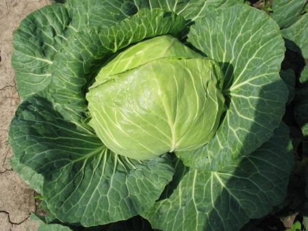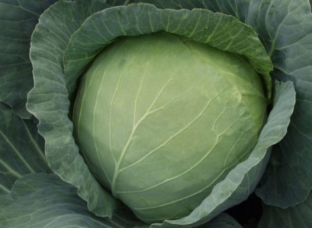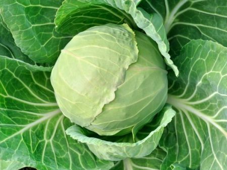 Các giống lai sẽ làm hài lòng với đầu chặt chẽ nặng 3-4 kg. Hình dạng tròn, lá có màu xanh đậm, bên trong có màu trắng như tuyết.