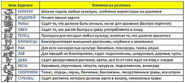 Theo lịch âm, những dấu hiệu cằn cỗi nhất của cung hoàng đạo là Bảo Bình, Bạch Dương và Sư Tử. Trong những khoảng thời gian này, nên hoãn công việc trồng cây cho đến thời điểm tốt hơn. Theo quan sát của những người làm vườn, thực vật được trồng trong khi những cung hoàng đạo này ở trên bầu trời có thể đơn giản là không phát triển. Và nếu chúng phát triển, thì theo quy luật, với những chiếc lá và quả khô héo yếu không có chất lượng tốt nhất. Do đó, khía cạnh này cũng đáng tập trung vào.