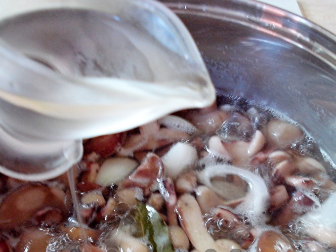 Chuyển nấm vào ướp và thêm giấm. Sau khi đun sôi, nấu thêm 7 phút nữa.