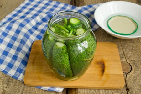 Sau khi rải dưa chuột vào lọ nửa lít, đổ chúng lên trên cùng với nước ướp được hình thành từ nước trái cây và gia vị, đậy nắp lại và khử trùng trong 20 phút. Sau đó cuộn lại và bọc trong một chiếc chăn ấm cho đến khi mát.