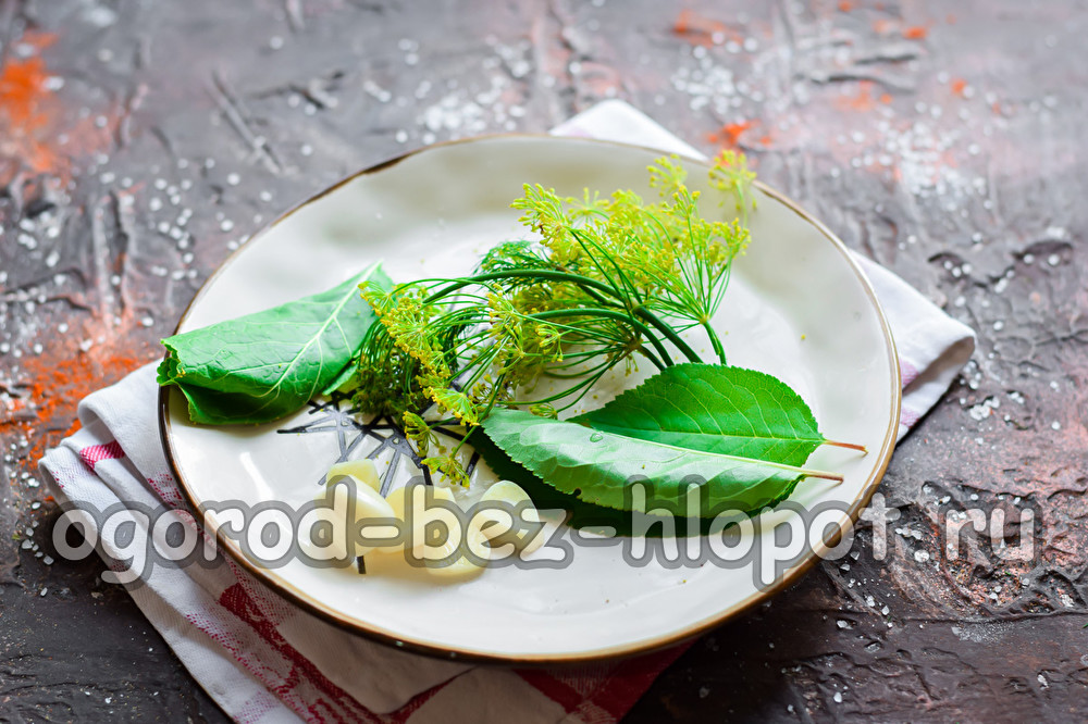 Chuẩn bị tất cả các thành phần cần thiết trong một danh sách. Rau xanh ngâm để chọn bất kỳ thứ gì bạn thích - hoa hồng thì là, lá anh đào, nho, cải ngựa. Rửa sạch và lau khô tất cả các loại rau xanh. Bóc vỏ và băm tỏi ngẫu nhiên.