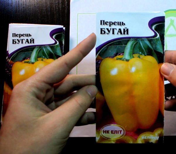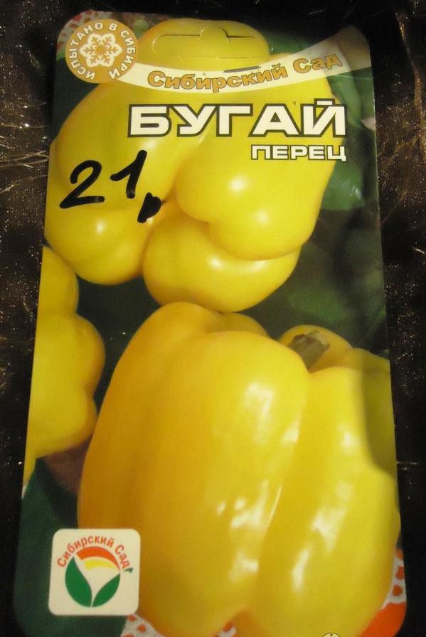Hạt tiêu Bugai có tên của nó vì kích thước của quả, trong điều kiện tối ưu có thể đạt tới 500 g. Mục đích chính của giống là tiêu thụ tươi. Những người yêu thích rau củ rất vui khi trồng loại hạt tiêu này, bởi vì nó có hương vị cần thiết rõ rệt của ớt chuông và có thành dày (dày tới 1 cm), ngon ngọt đến nỗi chúng có vẻ như chứa đầy nước.