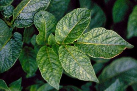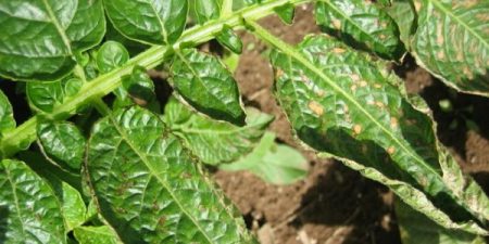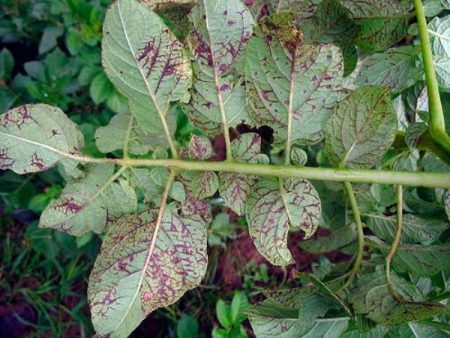 Dấu hiệu của bệnh: sự xuất hiện của các đốm đen trên lá, xoắn của chúng, sọc đen trên các gân lá. Tất cả điều này xuất hiện đầu tiên ở các tầng dưới, và sau đó đi vào giữa và trên. Lá khô và chết, chỉ còn lại một vài nhánh trên ngọn cây. Củ không phát triển, năng suất giảm đi rất nhiều.