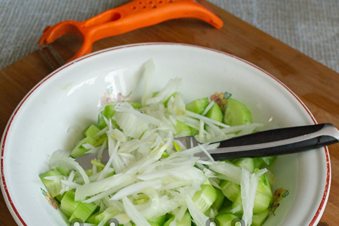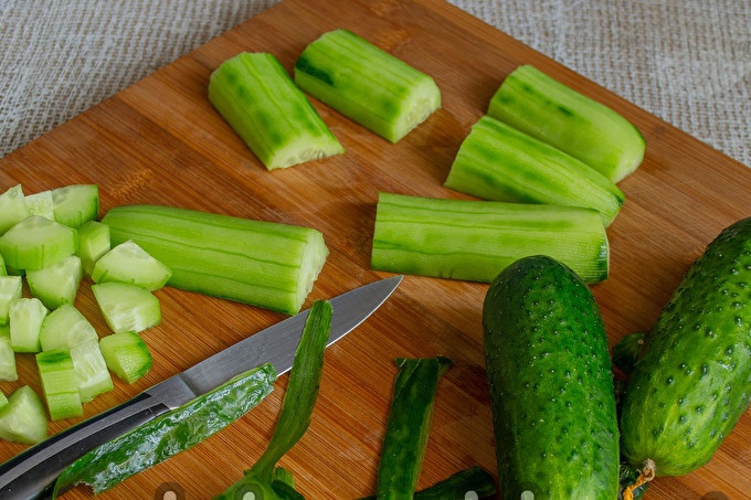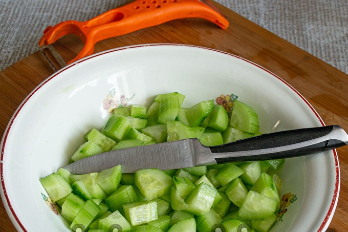 Thông thường, vỏ của dưa chuột phát triển quá thô và dày, vì vậy, trước hết, hãy gọt vỏ dưa chuột bằng một cái nạo rau, sau đó rửa sạch bằng nước lạnh và cắt thành khối.