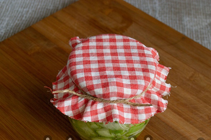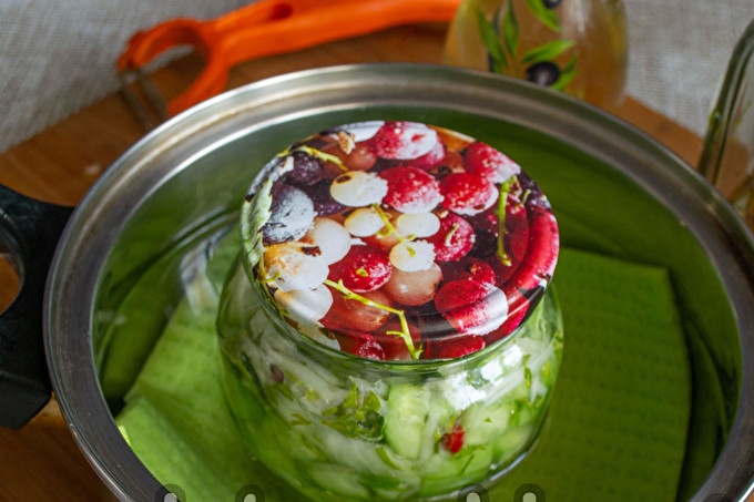 Dưới đáy chảo chúng ta đặt một miếng vải, đặt một lọ xà lách, đổ nước nóng đến 60 độ. Đun sôi, khử trùng lọ nửa lít trong 15 phút.