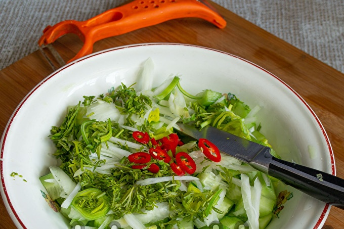 Chúng tôi rửa một bó thì là xanh với nước chảy, lắc, băm. Chúng tôi làm sạch vỏ ớt từ hạt và màng, cắt thành vòng.