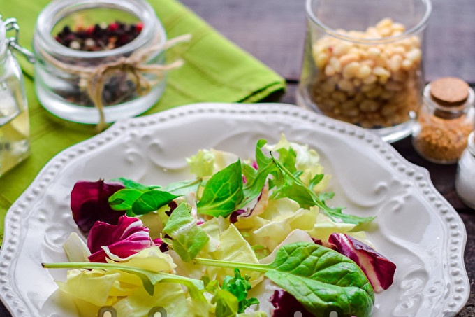 Rắc salad với hạt thông.