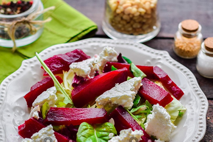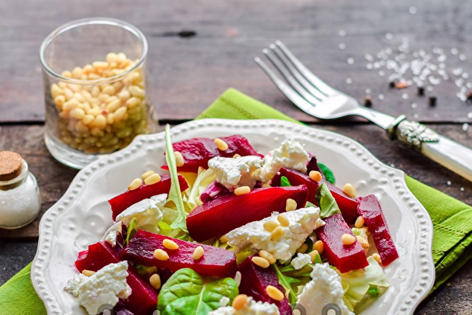Salad củ cải với phô mai dê và hạt thông là một món salad ngon, đơn giản và đồng thời khác thường, hóa ra là tuyệt vời, cả bên ngoài và hương vị.
