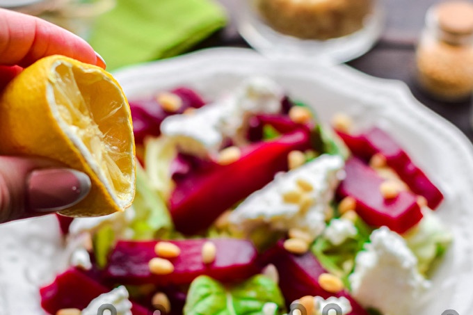 Salad củ cải đường nhẹ với phô mai dê và hạt thông