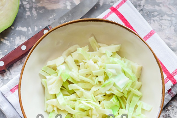 Chọn một bắp cải dày đặc, không có thiệt hại. Loại bỏ các lá trên cùng từ bắp cải. Cắt nhỏ bắp cải bằng ống hút hoặc dải - tùy thích. Gấp các lát vào một cái bát hoặc chảo ngay lập tức.