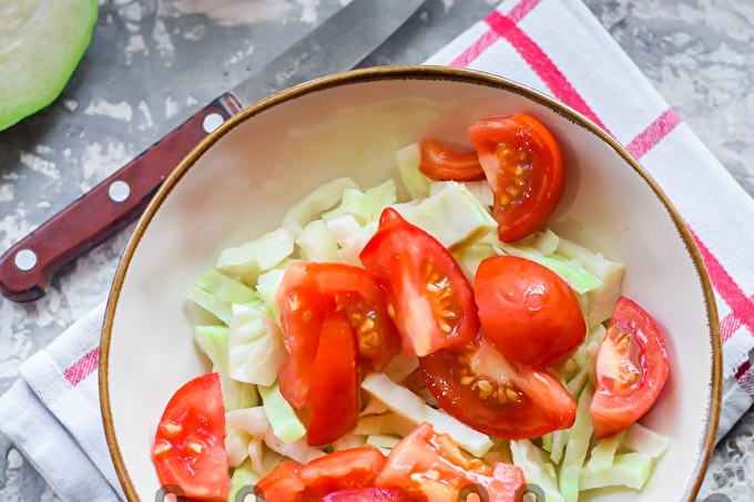 Rửa và làm khô cà chua, cắt bỏ vị trí phát triển thân. Cắt cà chua thành lát tùy ý, thêm vào bắp cải.
