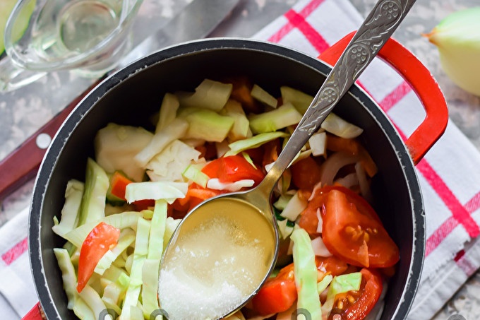 Khuấy nguyên liệu và cho vào chảo. Thêm dầu thực vật, đường và muối vào chảo. Xáo trộn mọi thứ và đưa vào lửa.