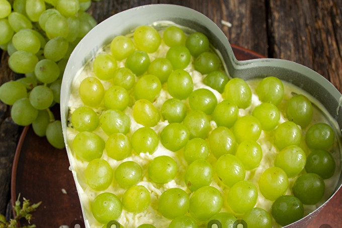 Lớp trên cùng là một loại nho không hạt màu xanh chua ngọt. Chúng tôi đặt các quả mọng một đến chặt chẽ.