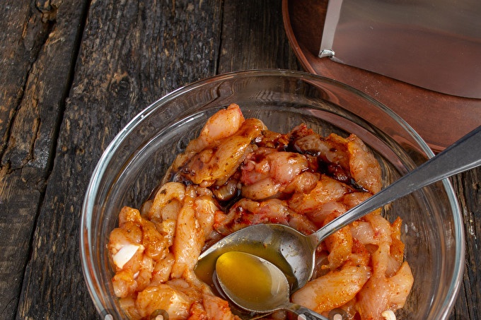 Thịt gà phi lê cắt thành dải mỏng. Thêm bột cà ri, bột nghệ, nước tương, mật ong lỏng, muối và hạt tiêu đen vào thịt gà băm nhỏ. Trộn kỹ, sau đó đổ 2 muỗng canh dầu ô liu. Vặn chặt bát bằng màng dính, cho vào tủ lạnh, ngâm trong 1-2 giờ.