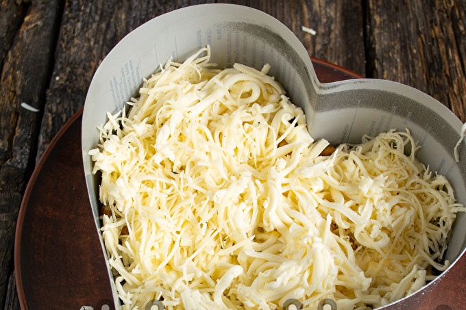 Nướng phô mai trên vắt - đây là lớp tiếp theo. Các loại phô mai có thể là bất cứ điều gì, chọn ví của sự lựa chọn của bạn.