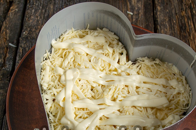 Đổ hạt vụn vào vòng, san bằng, đổ với mayonnaise