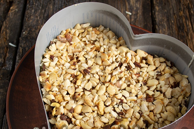 Chiên hạt trong chảo khô hoặc nâu trong lò nướng. Đổ các loại hạt trên bảng, bọc bằng màng dính, nhào một chiếc ghim lăn thành những mẩu vụn nhỏ.