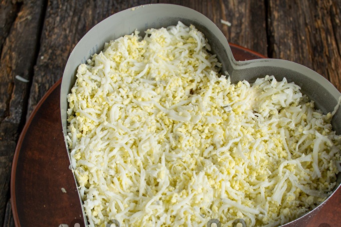 Mỡ lớp trứng một lần nữa bằng mayonnaise, nghiền nát salad bằng thìa hoặc thìa phẳng để các lớp được liên kết tốt trong vòng.