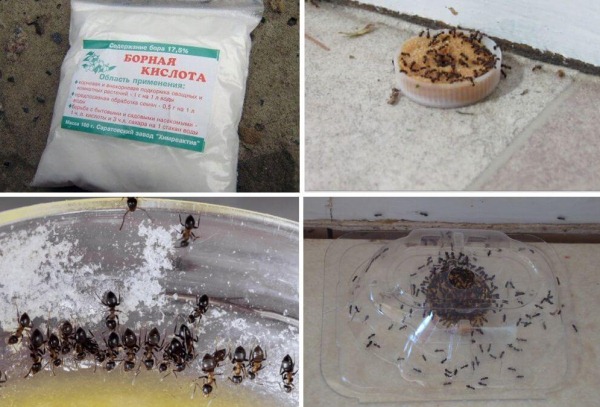 - Đường dựa. 6 muỗng canh. tôi đường trộn với 1 muỗng cà phê. axit boric. Đó là khuyến khích để thêm một chút mật ong. Hỗn hợp được đổ 2 muỗng canh. nước, trộn. Chất độc thu được được đổ vào các thùng chứa nhỏ, ví dụ, nắp nhựa và được đặt trên trang web.