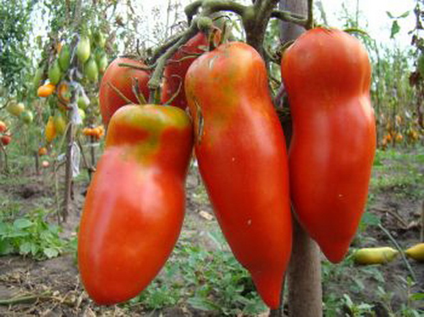 Trung bình sớm, năng suất đa dạng với số lượng quả trên một bàn chải, đạt 10 chiếc., Nặng tới 130 g, hình hạt tiêu nguyên bản, màu đỏ của quả. Các loại trái cây là thịt và ngon bất thường, phù hợp cho cả đồ hộp và salad. Một cây có buồng trứng tốt, từ các hoạt động nông nghiệp, cần đặc biệt chú ý đến việc chèn ép và thụ tinh.