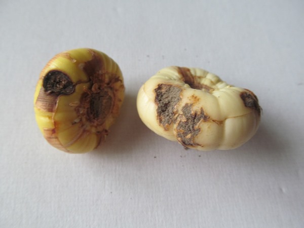 Hơn nữa, mỗi hành tây phải được kiểm tra cẩn thận để đảm bảo rằng không có dấu hiệu bệnh trên chúng. Thông thường, nếu có dấu hiệu thiệt hại, chúng có thể được nhận ra bằng mắt thường.Trong trường hợp này, các khu vực bị ảnh hưởng phải được cắt cẩn thận bằng một lưỡi dao sắc, và được xức bằng một chiếc lá màu xanh lá cây hoặc iốt, giống như một vết thương trên đầu gối, sau đó rắc nơi này bằng tro gỗ lạnh. Nếu bóng đèn bị ảnh hưởng hơn 50%, thì không cần phải lưu nó, nó phải bị vứt đi.