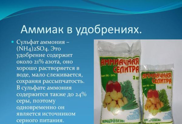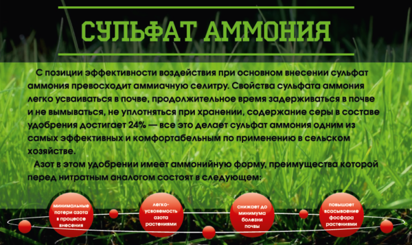 Ammonium sulfate là một loại phân khoáng khá phổ biến hiện nay. Thời điểm áp dụng của nó là mùa xuân, bởi vì nitơ có trong nó góp phần vào sự tăng trưởng tích cực của tất cả các loại cây trồng, các thành phần có chứa lưu huỳnh làm cho trái cây có chất lượng cao. Với sự chín của các loại rau và trái cây muộn, lưu huỳnh giúp bảo quản mùa đông dài của chúng. Nó chỉ ra rằng việc sử dụng phân bón ammonium sulfate là rất quan trọng trong các trang trại lớn và trong dachas tư nhân.