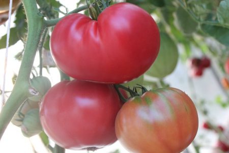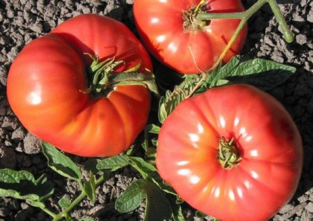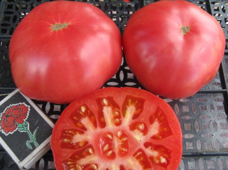 - Quả của quả cà chua to, tròn với hình dạng hơi dẹt. Màu hồng, thịt màu đỏ, vỏ mịn và mỏng. Nói chung, trái cây là thịt và dày đặc. Hầu như không có hạt giống. Khối lượng của một quả cà chua có thể đạt từ 400 đến 1000 g.