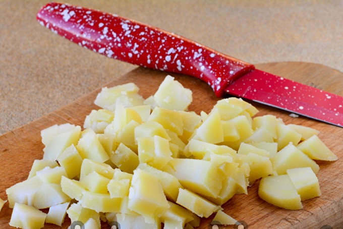 Gọt vỏ khoai tây nấu chín từ vỏ và cắt gốc cây thành khối vừa. Tốt nhất là để nguội rau sau khi nấu, và sau đó nấu salad.