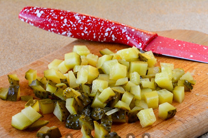 Với dưa chua, cắt đuôi, sau đó cắt theo cách tương tự: theo hình khối.