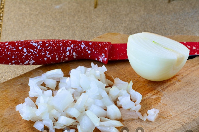 Cắt hành tây thành khối nhỏ, nó sẽ cho món ăn thêm hương vị và vị cay nồng.