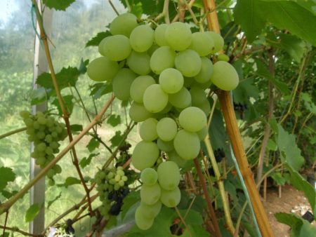 Tuyệt vời, năng suất cao. Cây mọc ở nước ta khoảng sáu năm. Các bụi cây bây giờ rất lớn. Đối với anh ta, chúng tôi đã xây dựng một lưới mắt cáo bằng gỗ với sáu cấp độ. Vào mùa thu, chúng tôi cúi xuống các chồi xuống đất và che phủ nó tốt bằng các nhánh linh sam, và vào mùa xuân, chúng tôi làm thẳng nó và buộc nó vào một giá đỡ với một cái quạt. Bunches được hình thành rất lớn ở mức 600-700 gram, đôi khi nhiều hơn. Quả mọng to, nhiều thịt, có hạt, nhưng rất ngọt và ngon ngọt. Tôi đặc biệt thích rằng không có dư vị hạt nhục đậu khấu.
