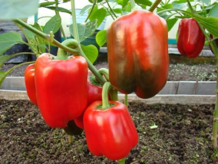 Các bụi cây của giống này rất mạnh mẽ, phát triển chiều cao lên đến một mét, nhưng tất cả phụ thuộc vào điều kiện phát triển. Trong nhà kính nó sẽ cao hơn, ở mặt đất mở - thấp hơn một chút.Trái cây - khối ớt có thành dày, có gân, với lớp vỏ dày bóng. Trọng lượng trái cây trung bình là 130 gram. Hương vị là tuyệt vời, và đánh giá bởi các đánh giá của người làm vườn, sự đa dạng này đã làm hài lòng nhiều người. Peppers được sử dụng để nhồi, món ăn phụ, nướng, và cũng phù hợp cho tất cả các loại bảo quản.