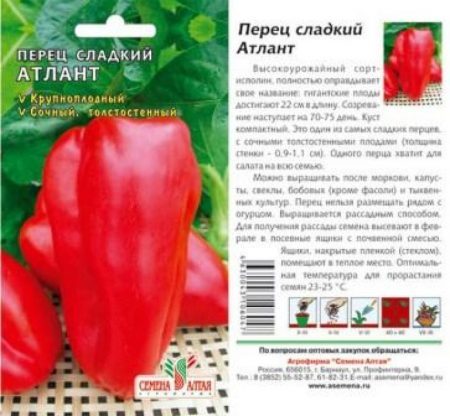 Hạt tiêu Atlant cũng được đưa vào Sổ đăng ký nhà nước của Liên bang Nga cho các giống. Đề xuất cho tất cả các khu vực, phát triển tốt dưới mái che phim. Chiều cao - lên tới 110 cm, xòe cành. Nhà máy đòi hỏi garter, hỗ trợ và hình thành bắt buộc.