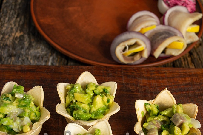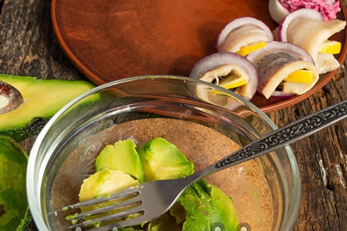 Chúng tôi thêm phi lê cá trích thái hạt lựu (khoảng 70 g) vào quả bơ, nêm các loại thảo mộc và nước chanh mới vắt.
