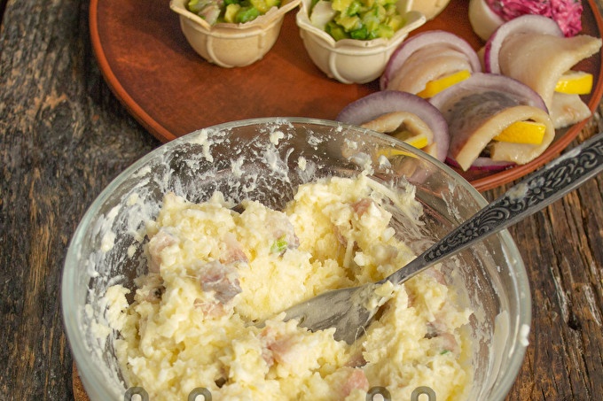 Chúng tôi chà khoai tây luộc và hai quả trứng luộc chín lên vắt mịn, thêm bơ mềm, cá trích băm nhuyễn (100 g) và một nửa phô mai kem.