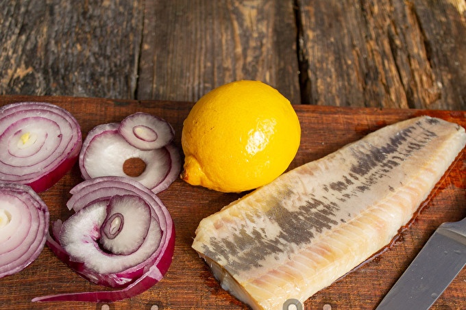 Với một con dao sắc, cắt phi lê cá trích dài thành những lát mỏng. Cắt hành tây đỏ thành vòng. Cắt chanh thành lát mỏng.