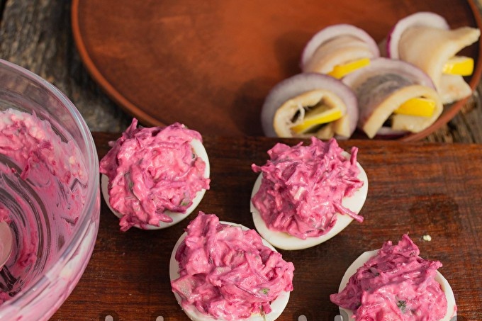 Chúng tôi trộn củ cải xay, lòng đỏ trứng, thì là băm nhuyễn, mayonnaise trong một cái bát, thêm cá trích băm nhỏ vào khối nhỏ, trộn kỹ.
